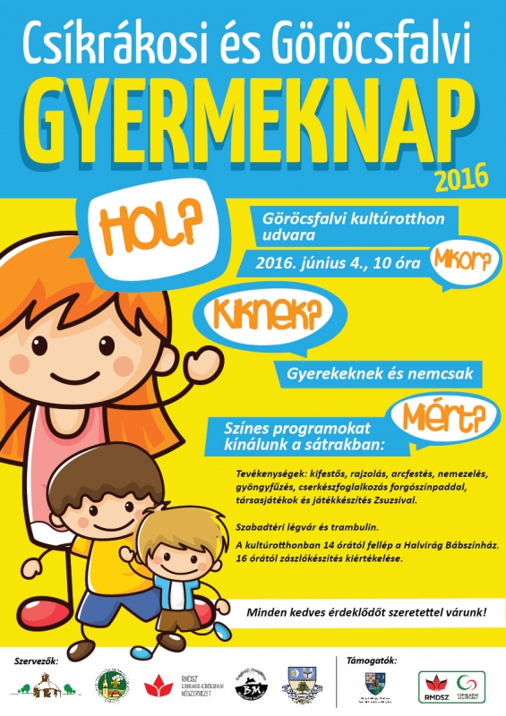 Sok szeretettel várunk kicsiket és nagyokat június 4-én, szombaton Göröcsfalván a kultúrotthon udvarán 10 órától.