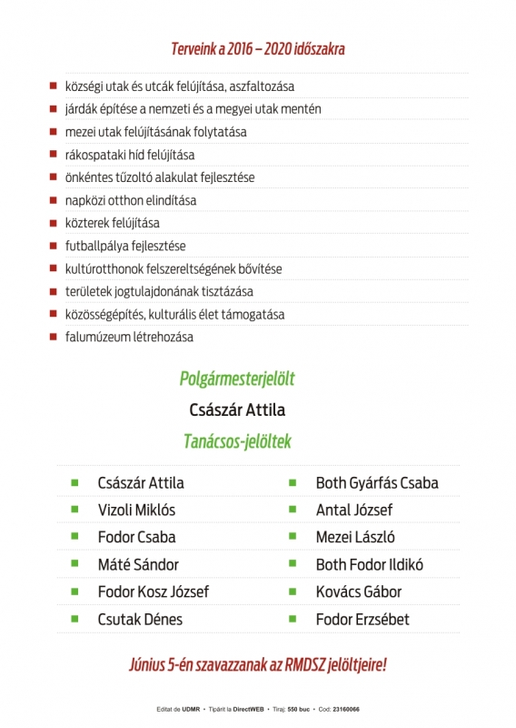 Ezúton köszönöm, hogy szavazatukkal újabb 4 évre bíztak meg a község vezetésével. A lakosság közel 60 %-a járult az urnák elé és többség a munkánk folytatására szavazott. Függetlenül, hogy kit támogattak a polgármesteri tisztségre és a helyi tanácsosi helyekre, ezután is a község érdekeit szem előtt tartva próbálok legjobb tudásom és lehetőségeink szerint dolgozni a következő négy évben. Köszönöm a bizalmat.