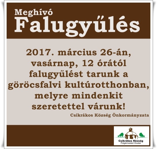 2016 december 18-án, vasárnap, 12 órai kezdettel Csíkrákos Önkormányzata évértékelő falugyűlést tart a göröcsfalvi kultúrotthonban.