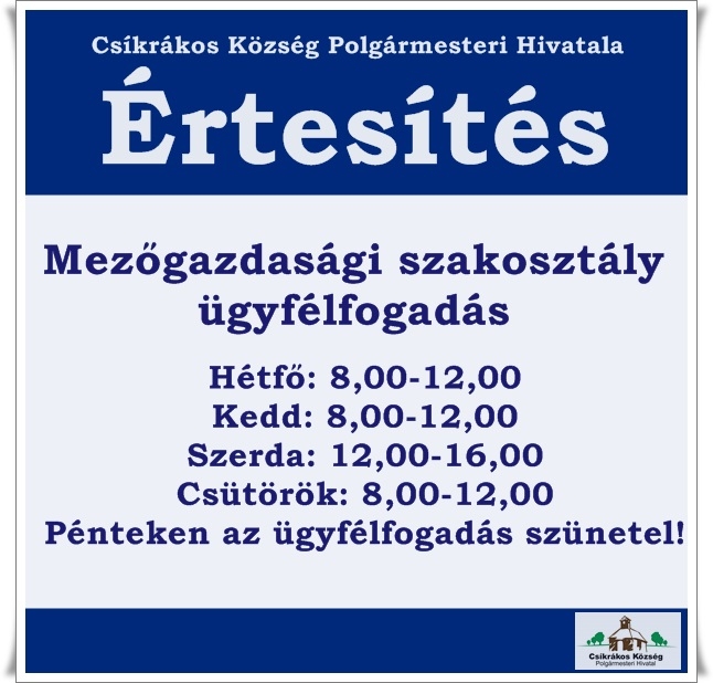 FELHÍVJUK A LAKOSSÁG FIGYELMÉT, HOGY MÁJUS 10-ÉN, KEDDEN A POLGÁRMESTERI HIVATALBAN NEM LESZ         ÜGYFÉLFOGADÁS.